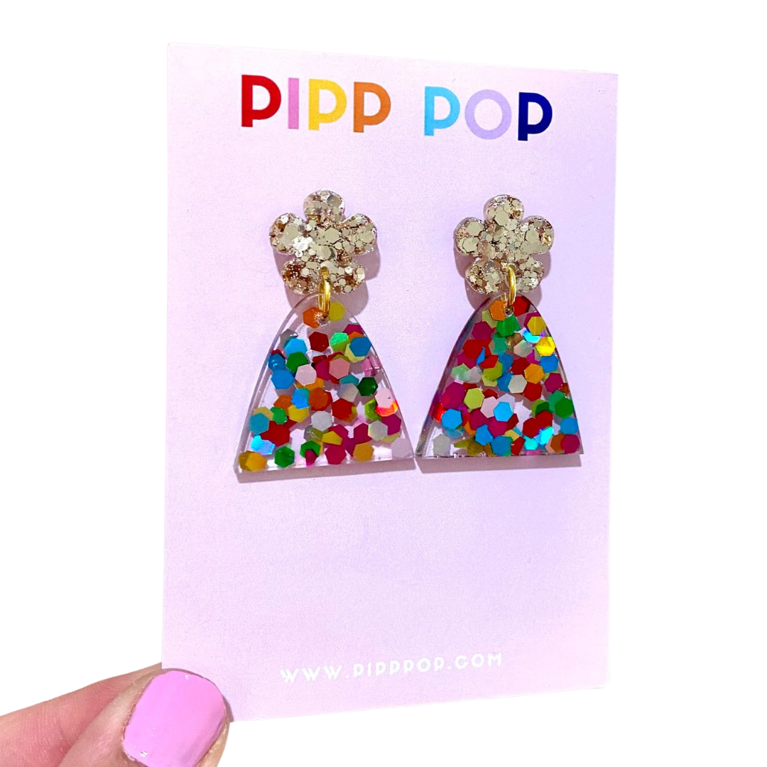 Designed with gold and rainbow gloss glitter resin pieces and finished with gold findings.