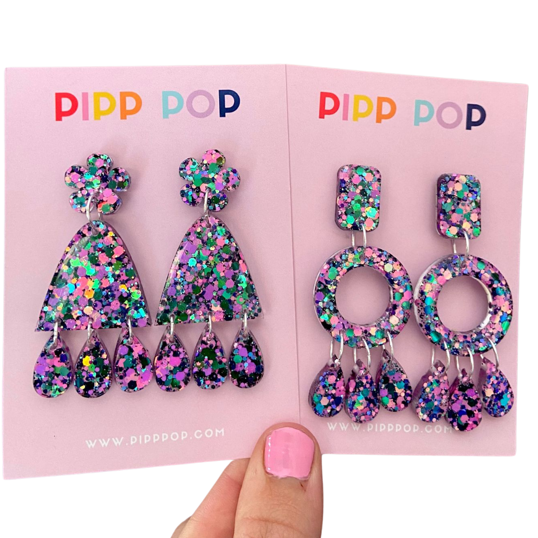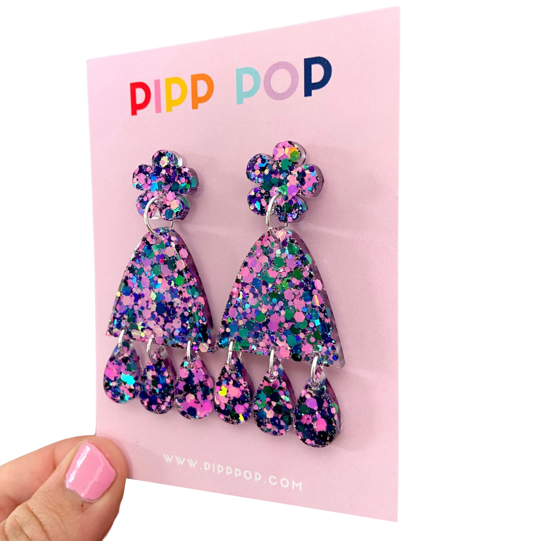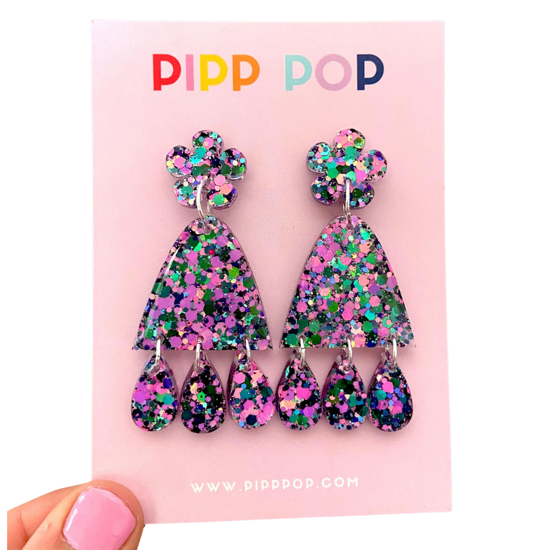 Whether you're attending a casual outing or a special occasion, our Suzie Glitter Dangles are the perfect choice for adding a whimsical and feminine touch to any outfit.